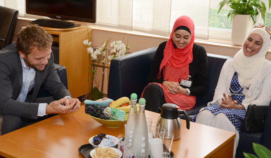 Det ble et trivelig møte mellom statsråden og Hanan El Boukri (i rødt) og Nour Al-Houda Thaythay (i hvitt). Lysbakken har tidligere vært på te-besøk hos Nour.