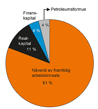 Selv om avkastningen av pensjonsfondet gir et viktig bidrag til å finansiere offentlig sektors utgifter, er fondet langt fra stort nok til å løse utfordringene ved en aldrende befolkning. Virksomheten i fastlandsøkonomien er hovedgrunnlaget for produksjon, sysselsetting og inntekt. Vår nasjonalformue består først og fremst av verdien av det arbeidet vi utfører – i dag og i framtiden, jf. figuren over.