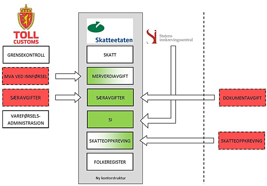 Tidligere har Regjeringen igangsatt et arbeid for å flytte særavgifter (inkl. dokumentavgiften) og merverdiavgift ved innførsel til Skatteetaten, og med å innlemme Statens innkrevingssentral i Skatteetaten. Med disse grepene vil fastsetting og innkreving av skatter og avgifter få en naturlig samling i Skatteetaten. Samtidig vil den nye tolletaten styrkes og rendyrkes til grensekontroll og vareførsel for å møte fremtidige utfordringer på grensen.