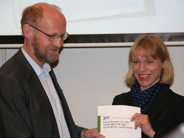 Kulturminister Anniken Huitfeldt mottok NOU 2010:14 Lett å komme til orde, vanskelig å bli hørt - en moderne mediestøtte av lederen for Mediestøtteutvalget Yngve Slettholm.