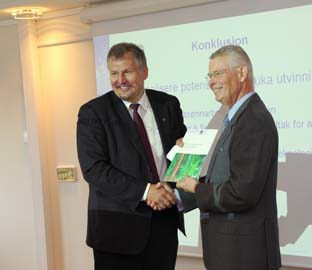 Foto: Olje- og energiminister Terje Riis-Johansen mottar rapporten fra utvalgets leder, Knut Åm