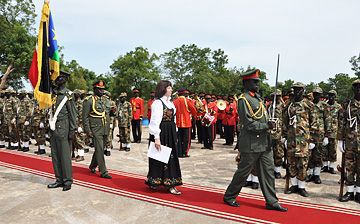 Ambassadør Ingrid Ofstad på vei for å overlevere sine akkreditiver til Sør-Sudans president Salva Kiir. (Foto: South Sudan Office of the President)