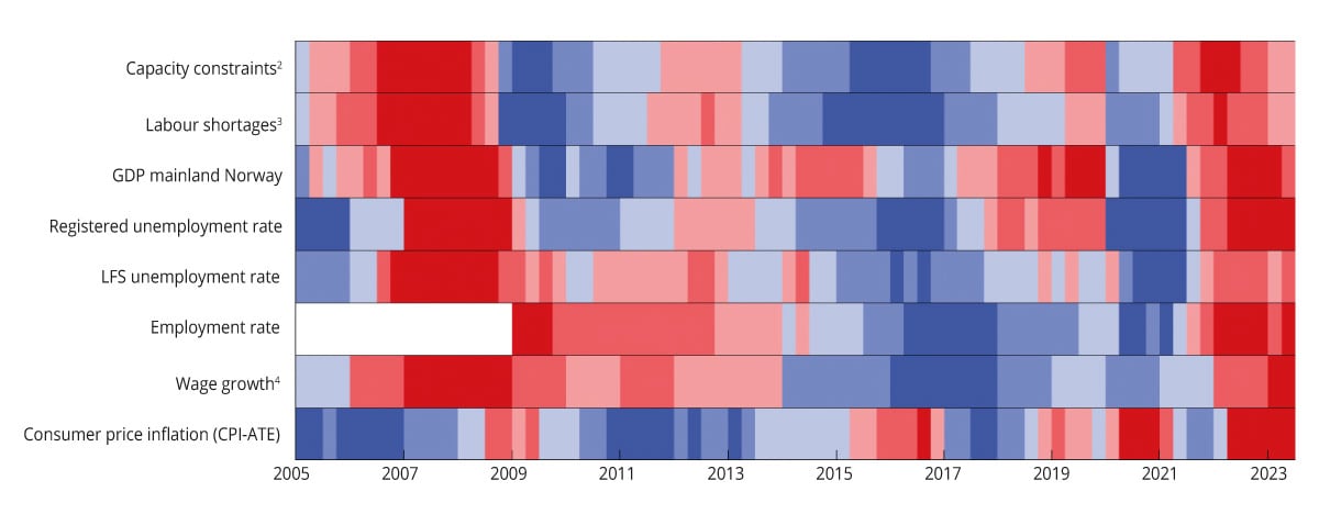 1 Shades of red are a sign the economy is running above full capacity, while shades of blue are a sign of a recession and spare capacity. The colour scale reflects how large the gap, or deviation from the average, is. The darkest colours represent the third of the observations with the largest positive and negative deviation. The indicators are measured as the deviation from the average for the period Q1 2005 – Q2 2023. Observations from the pandemic years 2020 and 2021 have been taken removed from the time series. The exceptions are consumer price inflation, which is measured as a deviation from the inflation target, and GDP, which is measured as a deviation from a simple trend where we have not removed the pandemic years. The trend is estimated using the Hodrick-Prescott filter, where the smoothing parameter is set at 6 400, which corresponds to 400 on an annual basis.
