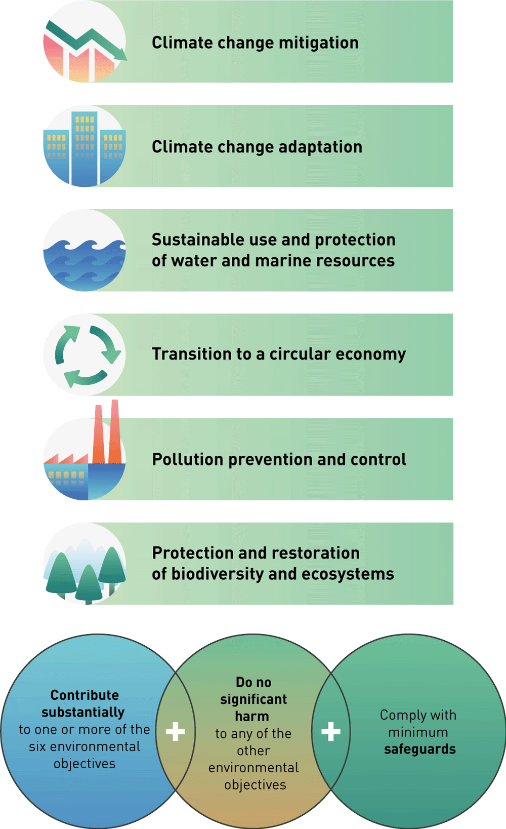 For an economic activity to be defined as sustainable in accordance with the EU taxonomy, it must contribute substantially to one or more of the six defined environmental objectives, which are shown in the green boxes. In addition, it must do no significant harm to any of the other environmental objectives, and must comply with minimum safeguards.