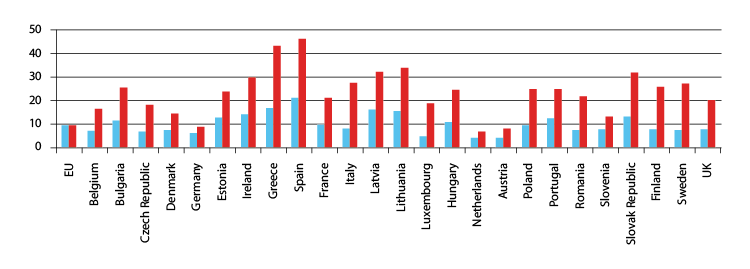 Figure 2.3 Unemployment in Europe, second quarter, 2011. Blue: 15–74 years, red: youth unemployment, 15–24 years.