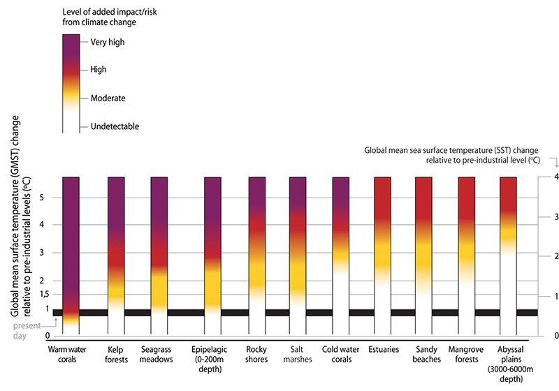 Figure 4.4 Assessment of impacts and risks for coastal and open ocean ecosystems under global warming. The left-hand y axis shows the rise in global mean surface temperature. The right-hand y axis shows the corresponding rise in global mean sea surface temperature. Temperature rise is relative to pre-industrial levels. The black band shows the present-day temperature.