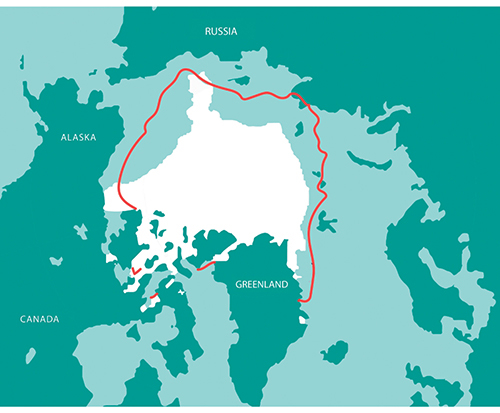 Figure 4.5 The map shows sea ice extent in the Arctic (white area) in September 2018. The red line shows the 1981 to 2010 average extent for the same month. Based on satellite images and the Sea Ice Index from the US National Snow & Ice Data Center.