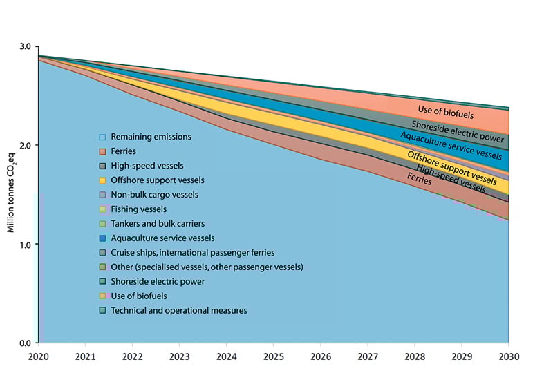 A Norwegian review of mitigation measures has been published analysing their potential for reducing emissions of greenhouses gases that are not included in the EU Emissions Trading System by 2030. The analysis was carried out by the Norwegian Environment Agency, the Norwegian Public Roads Administration, the Norwegian Coastal Administration, the Norwegian Agricultural Agency, the Norwegian Water Resources and Energy Directorate and Enova. The report identified measures that could reduce emissions from shipping, fisheries and aquaculture by 6.6 million tonnes CO2 equivalent in the period up to 2030. According to the report, intensifying efforts to speed up the transition to low- and zero-emission solutions in these industries will be important in achieving Norway’s climate target for 2030. Increasing food production from the oceans may also play a part in reducing greenhouse gas emissions. Dietary measures, which include increasing consumption of seafood, and measures to reduce food waste, are estimated to have emission-reduction potentials of 2.9 and 1.5 million tonnes CO2 respectively.