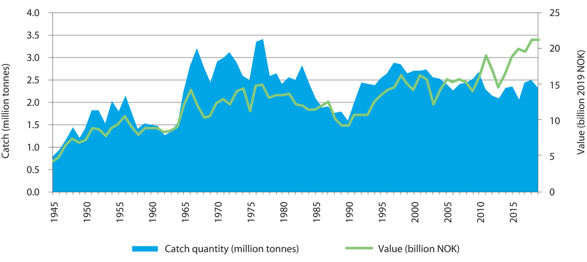Figure 5.1 Norwegian marine capture fisheries, 1945–2019. The figure shows catch quantity (blue area) and landed value (green line).
