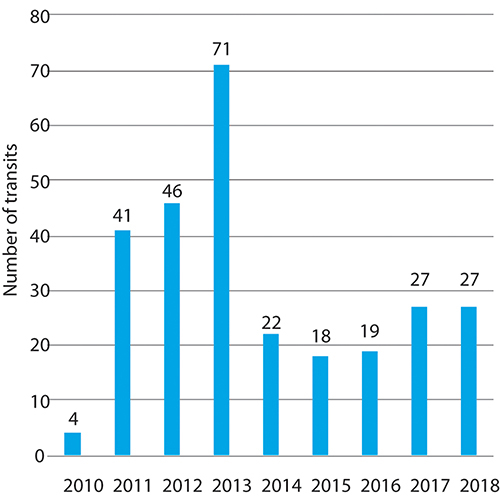 The number of cruise passengers increased by 64 % from 2011 to 2017, while the number of day-trippers who went ashore from cruise ships in Norwegian ports rose by nearly 50 %. In total, around three million day-trippers from cruise ships went ashore in Norwegian ports in 2017. According to the Institute of Transport Economics, almost 83 % of the growth in cruise ship calls in the 10-year period 2008–2018 was in Western Norway. In North Norway, the annual number of port calls has varied, but overall there has been a weakly rising trend over time. Moreover, average ship size (measured in terms of maximum number of passengers) in North Norway increased from 607 to 1 120 passengers from 2006 to 2018, which indicates that the number of cruise passengers visiting North Norway has been increasing.