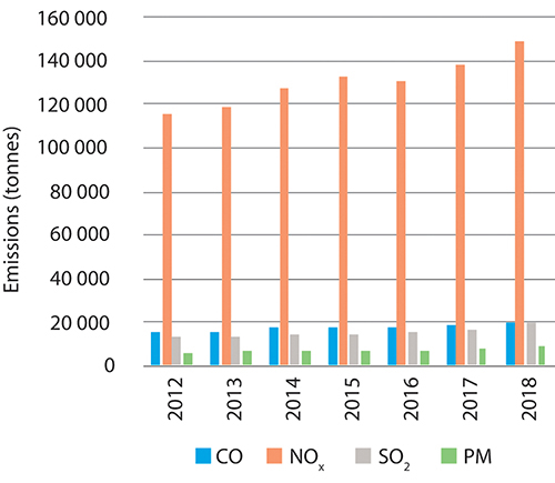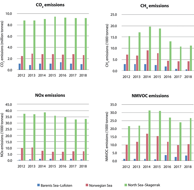 Figure 5.17 Emissions to air of CO2, NOX, CH4 (methane) and NMVOCs (non-methane volatile organic compounds) from petroleum activities in the three management plan areas, 2012–2018.