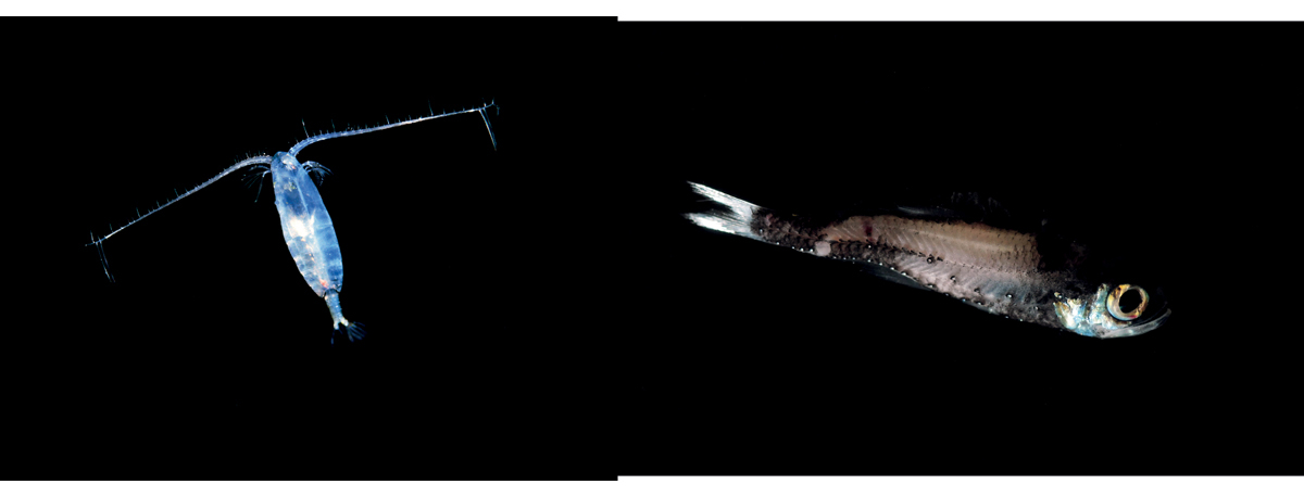 Figure 5.2 The copepod Calanus finmarchicus (left) and a mesopelagic lanternfish (right).