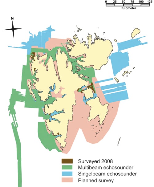 For 2008, 751 km2, as shown in Figure 11.1, was surveyed. The pink areas show where hydrographic surveys are planned in coming years.