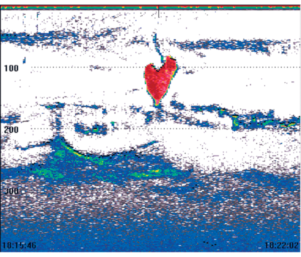 Norway advocates a knowledge-based approach to conservation and sustainable use in Antarctic waters. The red heart shape is a krill swarm under attack by a seal or penguin (the vertical blue line near the top of the ‘heart’). The image was made with sonar aboard the research vessel James Clark Ross during a joint Norwegian-British mission. The image belongs to Norway’s Institute of Marine Research and the British Antarctic Survey.