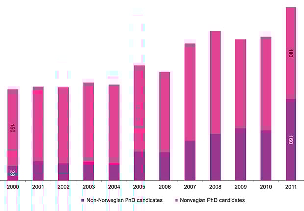 Source NIFU Doktorgradsstatistikk, februar 2012 [Nordic Institute for Studies in Innovation, Research and Education. Doctoral Degree Statistics, February 2012]
