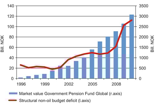 Figur 2.11 Structural, non-oil budget deficit1 and market value of the Government Pension Fund – Global over time.