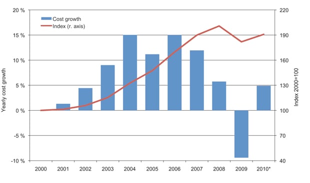 The consultant firm Econ Pöyry has established a cost index for field development projects on the Norwegian Shelf which confirms this picture. Estimates for the period 2004–2008 show an average increase of 15 per cent per year. This trend continued through 2009, wherein the cost of completing a selected group of projects was 12.5 per cent higher than the previous year. Econ Pöyry points to the rig rates as an important driver in this cost development, with a near tripling of rig rates in the period 2004–20086. It is presumed that this trend was largely caused by factors in the rig market.