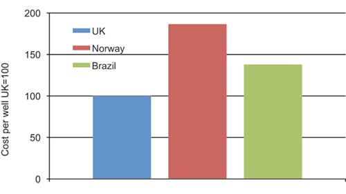 Norway also emerges as a high-cost country when it comes to exploration activity, cf. Figure 2.18. The cost of drilling exploration wells on the Norwegian Shelf in waters shallower than 400 metres are about 85 percent higher than on the UK Shelf and 35 per cent higher than on the Brazilian Shelf. Hiring of rigs and associated personnel, field evaluation and other administration are the most important explanations for the cost differences.