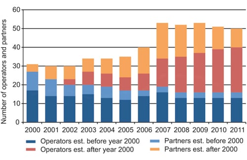 Figur 2.19 Number of operating companies and licensees divided between companies established before and after 2000.