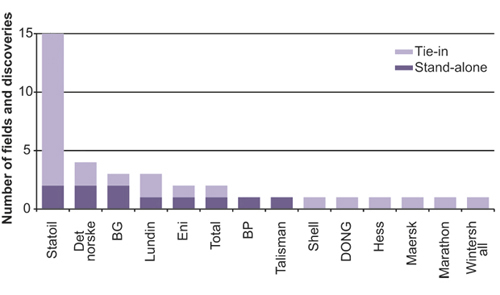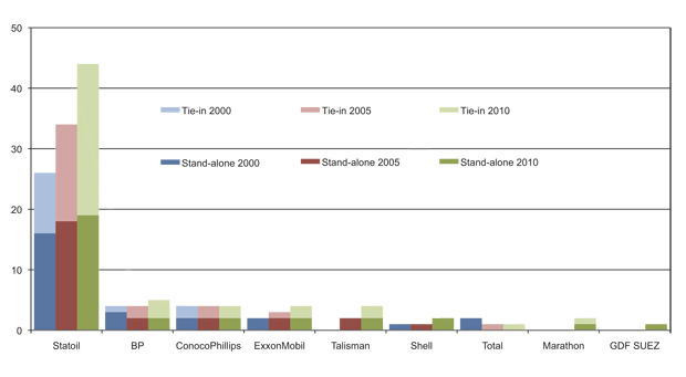 Statoil is currently the largest operator of producing fields on the Norwegian Shelf, cf. Figure 2.24. This is a consequence of the fact that the company was awarded a number of operatorships in the early years of the petroleum activity, including many of the major fields on the shelf. At the same time, Statoil has worked diligently to explore adjacent areas and to mature resources. This has contributed to many new field developments in recent years, particularly as regards satellite fields.