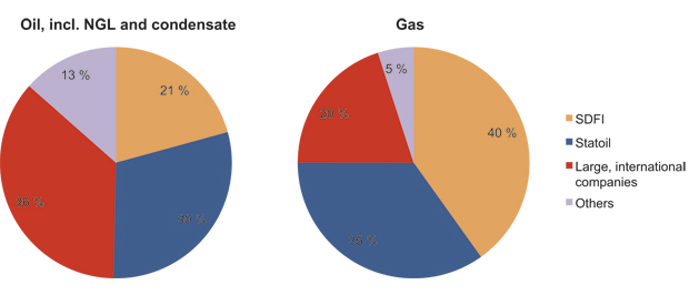 Ownership of the gas reserves is somewhat more concentrated, but follows the same general pattern as for the oil resources. SDFI represents 40 per cent of the ownership of gas reserves, while Statoil owns 35 per cent. A group of major international oil companies comprising Shell, Total, ExxonMobil, ConocoPhillips, GDF Suez and Eni each own more than one per cent, and together they own 20 per cent of the gas reserves. The remaining gas reserves are owned by a group comprising more than 20 companies which together own a total of five per cent.