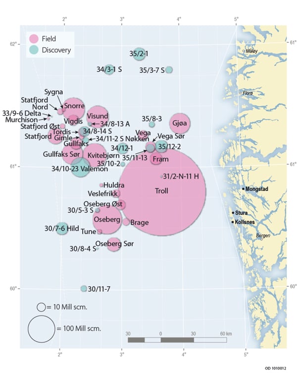 Figur 2.27 Fields and discoveries in the northern part of the North Sea. The size of the circle indicates the total remaining resource volume.