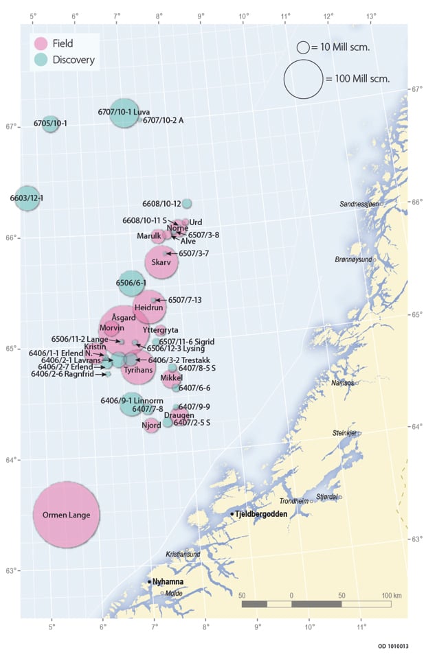 It has been proven that the Norwegian Sea contains a lot of gas. Produced gas from the fields is transported in the ÅTS pipeline to Kårstø in Rogaland, and in Haltenpipe to Tjeldbergodden in Møre og Romsdal. The gas from Ormen Lange runs in a pipeline to Nyhamna, and from there on to the United Kingdom. The CO2 content of the gas produced from several of these fields is relatively high, which is also the case for several of the discoveries in the area. Gas from these fields is therefore blended with other gas with lower CO2 content to achieve compliance with gas quality requirements. This blending takes place from fields both in the Norwegian Sea and from fields located further south. This creates interdependence between the fields in the Norwegian Sea, and affects how the individual fields are produced.