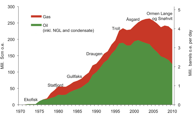 The basis of income from petroleum production is undergoing significant change. Since 2001, oil production on the Norwegian Shelf has been gradually reduced, while gas production has increased. The year 2010 marked the first time that more gas was sold than oil.