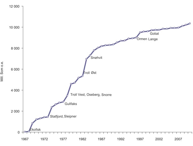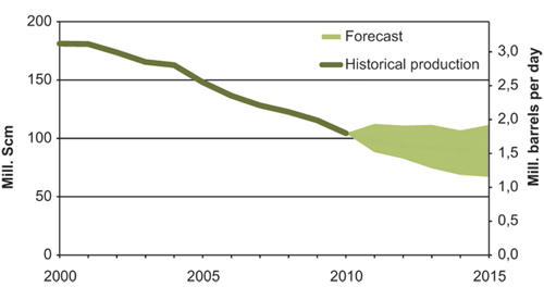At the end of 2010, the total recoverable resources are estimated at between 10 and 16 billion scm of oil equivalents (o.e.)1, with 13 billion scm o.e. as the expected value. A total of 5.5 billion scm o.e. has been produced, which means that about 40 per cent of the expected recoverable resources have been produced to date.