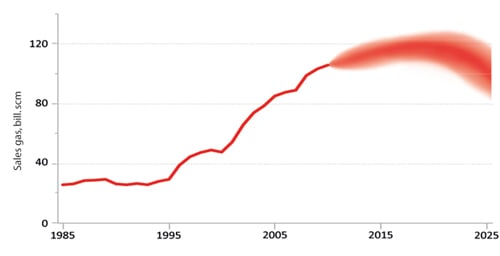 Gas production is expected to peak around 2020, cf. Figure 2.8. At that time, annual gas production is estimated at between 105 and 130 billion scm o.e. The production level after 2020 will largely be determined by the new discoveries made in the years to come.