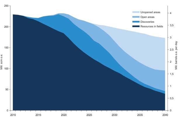 The activity level in the petroleum activities over time depends on how much of the remaining resources are utilised. If merely the current investment plans are implemented, the petroleum activity will quickly decline. Strong efforts in existing fields, new profitable field developments and exploration will provide the basis for a high and stable activity level in the future as well. In a time perspective beyond 2020, exploration in opened areas and access to new exploration area will be crucial as regards the activity level. Measures are necessary within all these areas to ensure the industry has new tasks. Therefore, the Government has decided to start an opening process for the sea areas around Jan Mayen and the part of the formerly disputed area west of the delimitation line in the Barents Sea South.