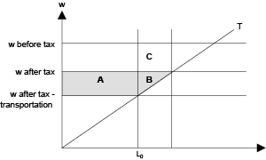 What is the economic effect of the transportation measure? The disposable income of those who were already participating in the labour market will be higher after the elimination of the transportation costs. This is represented by area A in Chart 7.2. Moreover, the increase in labour supply, either by those who participated in working life increasing the number of hours worked or by new people entering the labour market, will benefit the employees involved, inasmuch as what they earn from work exceeds their value of leisure. This is represented by areas A and B in Chart 7.2. These effects will be captured by an ordinary cost-benefit analysis. However, the value of the production generated by the increase in labour supply corresponds to the wage before tax. The difference between the economic value of increased employment and the value reflected in individual decisions is represented by area C in Chart 7.2. This corresponds to the value of the increase in tax revenues resulting from increased employment, and represents a net wider impact of increased employment in an economy with a tax on labour income.