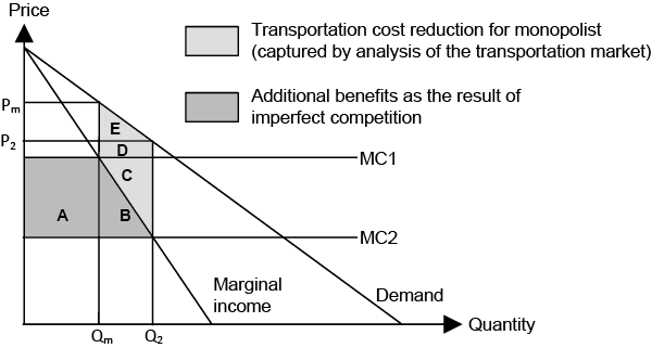 Let us look at a firm operating in a market characterised by imperfect competition, which firm may therefore charge a price in excess of marginal cost. Assume also that the said firm is facing transportation costs that vary in proportion with its production level, thus implying constant marginal costs. In Chart 7.3, this is illustrated by a monopolist, and the profit-maximising price and output of the monopolist is given by the point Pm, Qm. If a transportation project results in lower transportation costs for the firm, this will, all else being equal, mean lower marginal costs for the firm, illustrated by a shift in the marginal cost curve from MC1 to MC2. The firm responds to the lower production costs by reducing its price and increasing its production to P2, Q2. The area A+B corresponds to the benefits captured as the value of reduced generalised travel costs for the business sector in an ordinary cost-benefit analysis. We note from Chart 4.3 that, since the firm is able to charge a price in excess of marginal costs, consumers’ willingness to pay for one additional unit (as illustrated by the demand curve) exceeds the cost of producing such unit (the marginal cost curve). When production is expanded, this results in an efficiency benefit that is additional to that captured by an ordinary cost-benefit analysis. Such additional efficiency benefit is illustrated by the area C+D+E in Chart 7.3. This efficiency benefit is not captured by the firm and represents net wider impacts of expanded production in markets with imperfect competition.