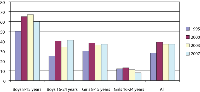 Figure 5.2 Use of video games on a random day 1995–2007. 8–24 years. Expressed as percentages.