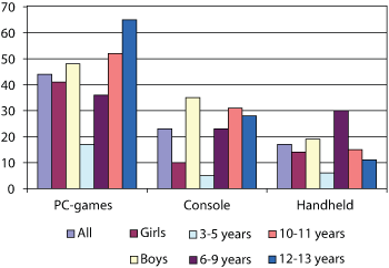 According to TNS Gallup’s survey, virtually all children (96 per cent) have access to technical equipment in the home that video games can be played on. The greatest access is to PCs, but Sony PlayStations and hand-held consoles are also found in very many homes. The newer consoles (Xbox, Wii) are not yet widely available.