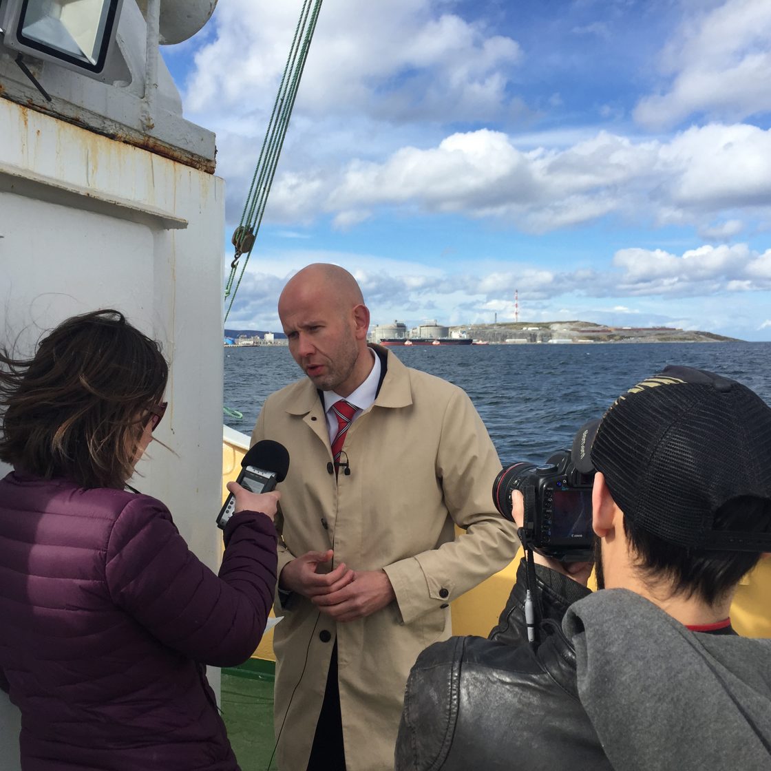 Tord Lien intervjues ombord MS Mårøy med Melkøya i bakgrunnen.