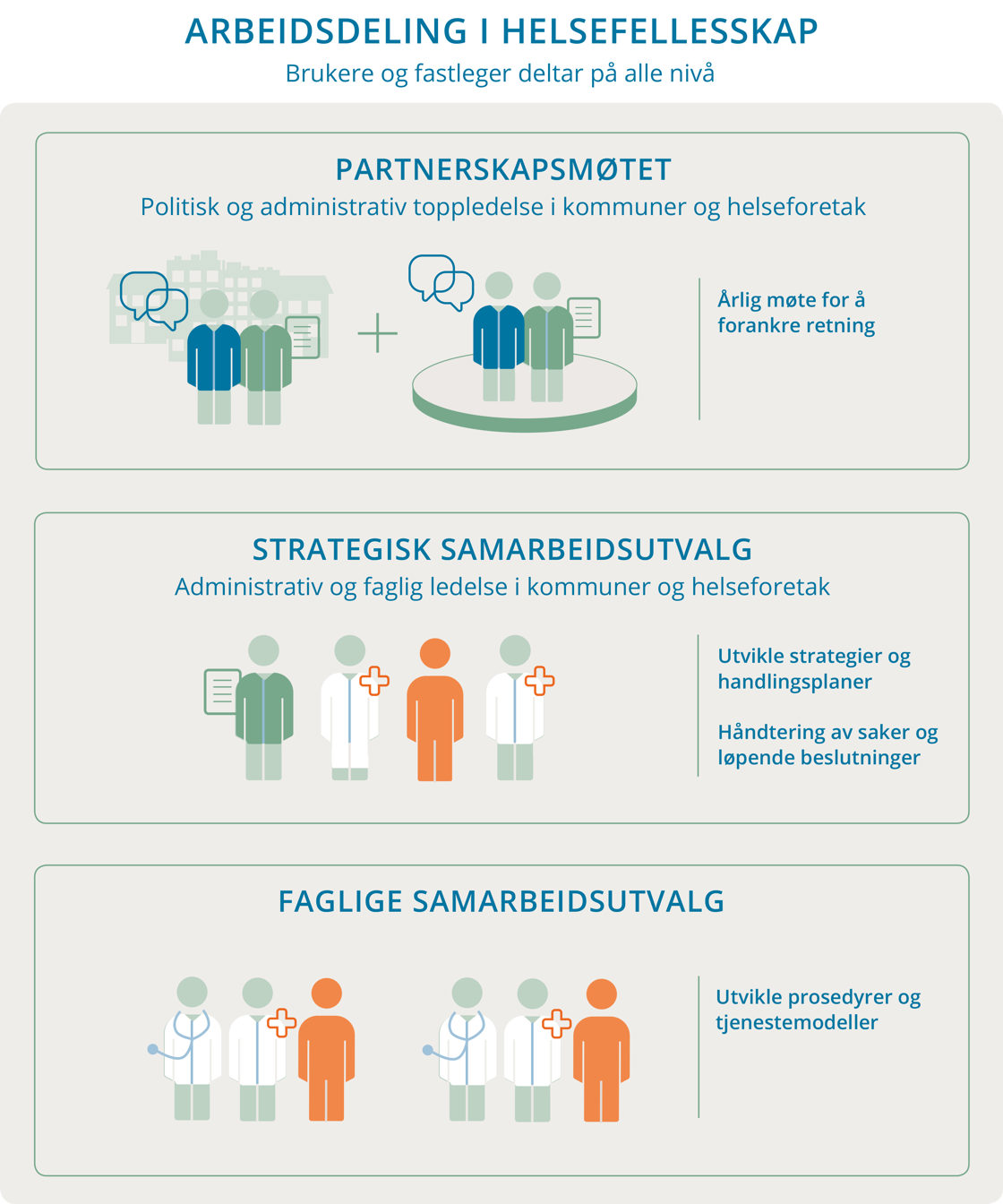 - Det neste nivået, strategisk samarbeidsutvalg, møtes administrativ og faglig ledelse. De beslutter de konkrete pasientforløpene og hvordan tjenestene skal utvikles.