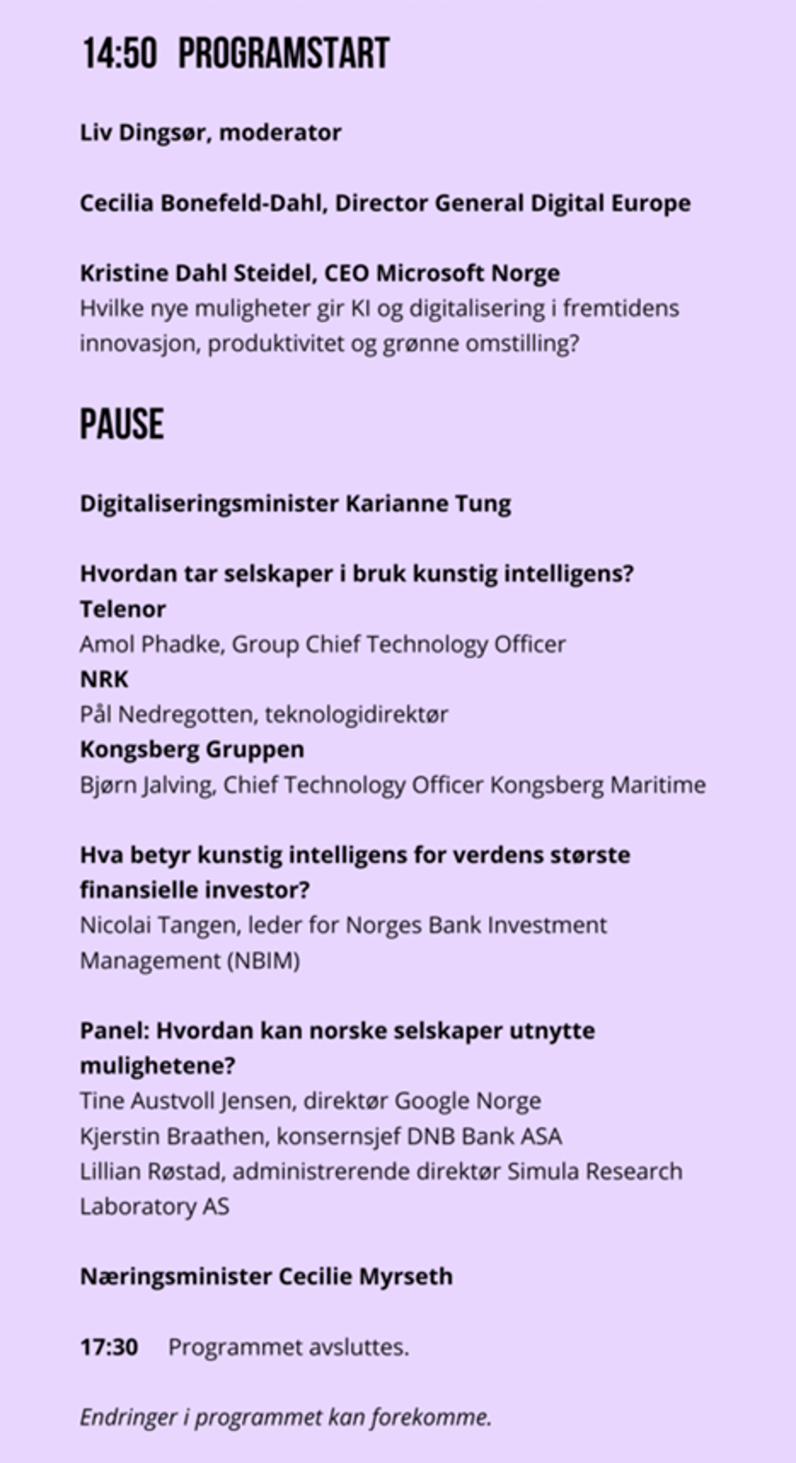 Gjennom konkrete eksempler fra selskaper og innlegg fra ledere og eksperter, belyste konferansen muligheter og utfordringer knyttet til kunstig intelligens – både når det gjelder selskapenes kompetansebehov, grønn omstilling og verdiskaping, samt betydningen for selskapenes sikkerhets- og aktsomhetsvurderinger.