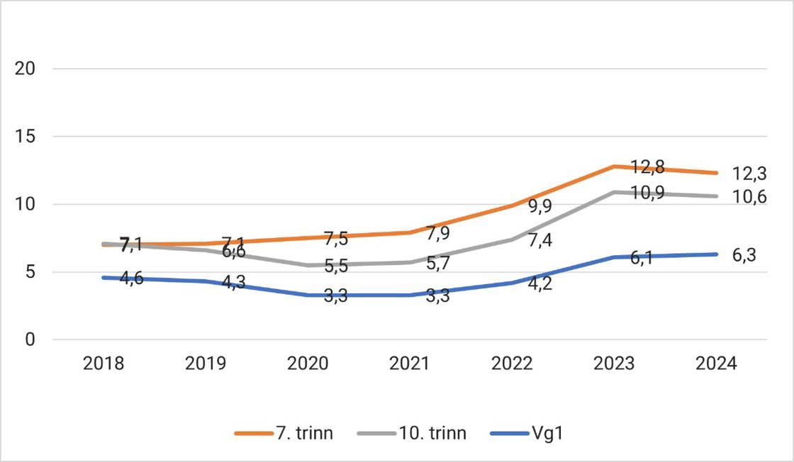 Elevundersøkelsen 2024, som Utdanningsdirektoratet publiserer i dag, viser at andelen elever som opplever mobbing ligger på 12,3 prosent på 7. trinn, 10,6 prosent på 10. trinn og 6,3 prosent på vg1. Det er omtrent på nivå med året før. (se figur)