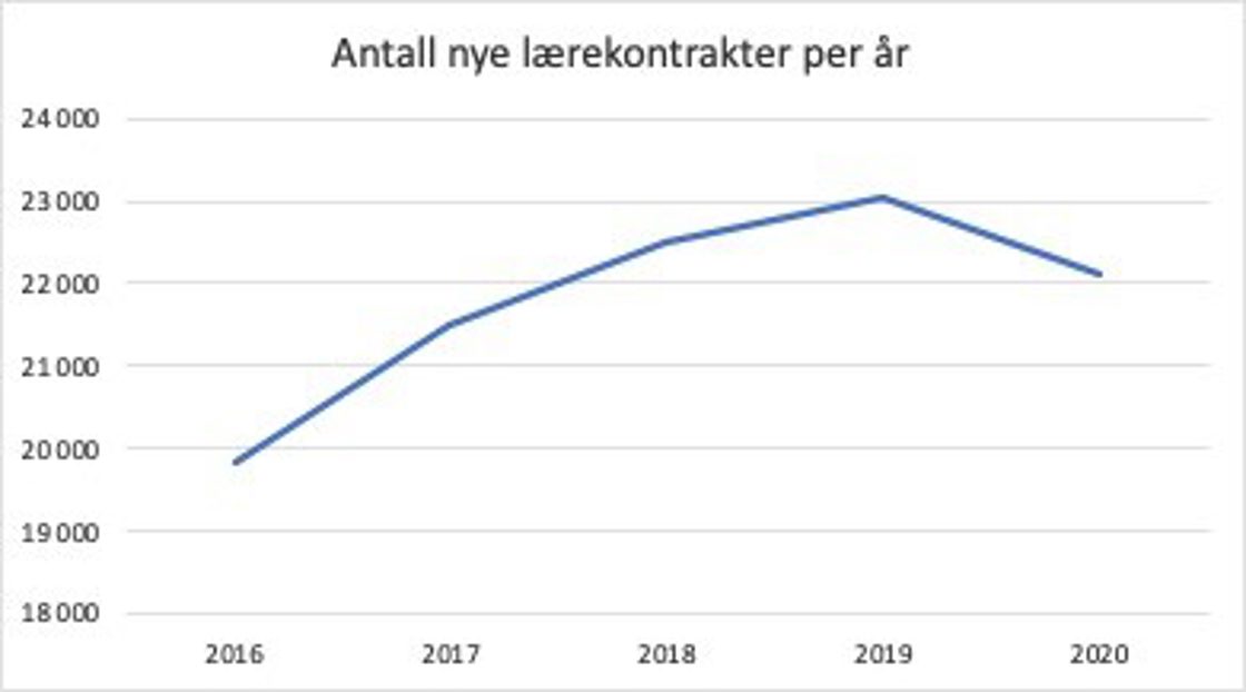 De siste ti årene har antallet nye lærekontrakter økt hvert år, men i fjor var det en nedgang på 4 prosent sammenlignet med året før.