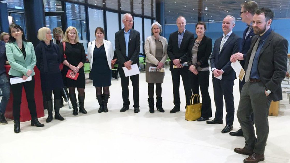 Kunnskapsminister Torbjørn Røe Isaksen og kommunal- og moderniseringsminister Jan Tore Sanner skal sammen med blant andre Trude Tinnlund fra LO (t.v.) og Hans Eriks Skjæggerud fra YS jobbe for flere læreplasser. Mandag møtte de Martin Nesser på Kuben videregående skole.