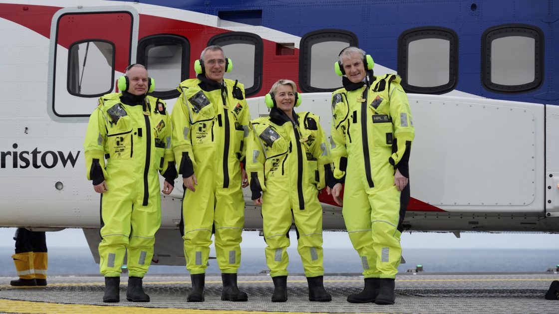 Statsminister Jonas Gahr Støre, NATOs generalsekretær Jens Stoltenberg, EU-kommisjonens president Ursula von der Leyen og Equinors konsernsjef Anders Opedal besøkte fredag Troll A-plattformen.