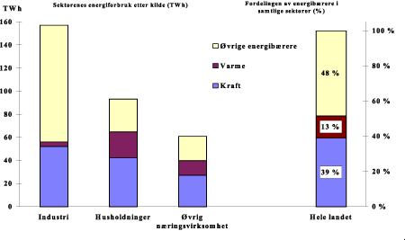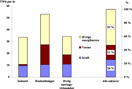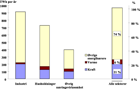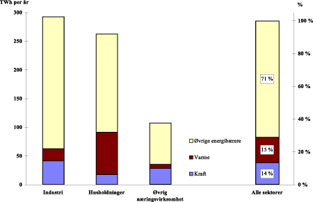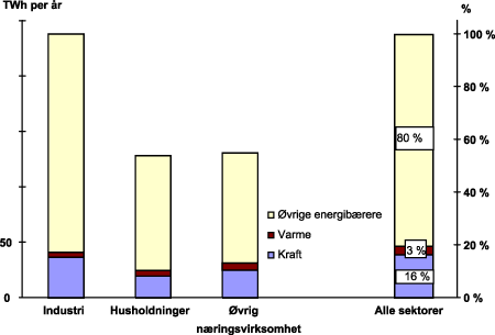 Elforbrukets andel av det totale stasjonære energiforbruket er bare 14 prosent, se figur 9.16. Varmeforbruket er av samme størrelsesorden. Industriens andel av det stasjonære energiforbruket er i overkant av 40 prosent og noe høyere enn husholdningenes andel.