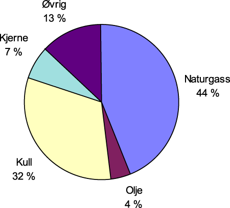 Naturgass er også den viktigste energibæreren i kraft- og varmeproduksjon. Omlag 45 prosent av kraftproduksjonen er basert på naturgass, se figur 9.15. Fortsatt utgjør også kullkraft en betydelig andel av den totale kraftproduksjonen. Totalt er omlag 80 prosent av kraftproduksjonen basert på fossile brensler. I tillegg kommer kjernekraftproduksjon og kraftproduksjon basert på ulike fornybare energikilder.