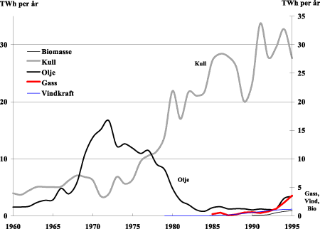 Av den termiske bruttoproduksjonen på 127 TWh i 1995, kom 15 TWh fra verk som produserte både kraft og varme. Disse verkene er lokalisert ved de større byene i tilknytning til fjernvarmenett. Omlag 45 prosent av varmeproduksjonen kommer fra slike kombinerte anlegg, resten fra rene varmeverk basert på kull.