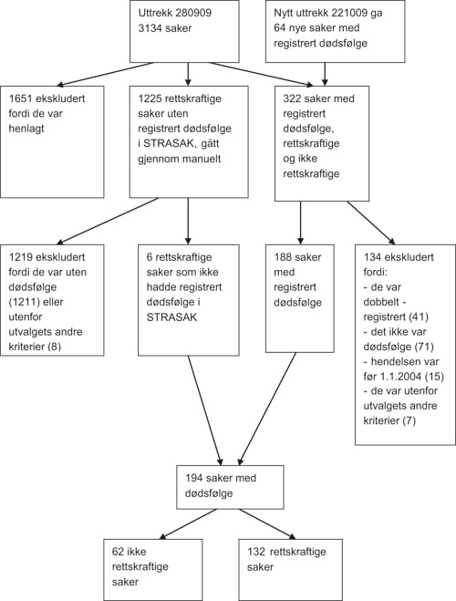 Dette siste uttrekket ga 64 nye saker med registrert dødsfølge, og de to uttrekkene ga totalt 322 saker med registrert dødsfølge. Av disse måtte 134 saker ekskluderes, hvorav 71 saker på bakgrunn av at manuell gjennomgang viste at det likevel ikke forelå dødsfølge.