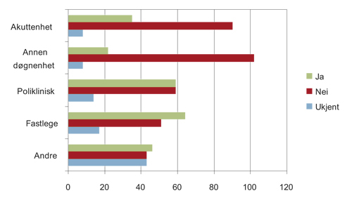 Det var totalt 97 gjerningspersoner (78 %) som tidligere hadde hatt kontakt med hjelpeapparatet på grunn av psykiske problemer. Det var 27 personer som ikke hadde hatt slik kontakt, mens for 8 gjerningspersoner er det ukjent hvilken kontakt det har vært. Den hjelpeinstansen som flest hadde benyttet ved psykiske problemer, var fastlegen (64 personer, 56 %). Dette støtter tidligere funn om at fastlegen er den vanligste hjelpeinstans i forbindelse med psykiske problemer. 9 Den nest mest vanlige hjelpeinstansen var poliklinisk spesialisthelsetjeneste (59 personer, 50 %) (figur 8.1). Poliklinisk spesialisthelsetjeneste kunne her vært via psykisk helsevern eller via tverrfaglig spesialisert rusbehandling. Det var totalt 35 gjerningspersoner (28 %) som hadde vært innlagt på akuttenhet innen psykisk helsetjeneste, mens 27 gjerningspersoner (22 %) hadde vært innlagt på annen døgnenhet innen psykisk helsetjeneste enn akuttenhet.