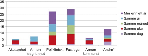 Når man kobler informasjonen om når og med hvem siste kontakten fant sted (figur 8.2), ser vi at det er fastlegene, poliklinisk spesialisthelsetjeneste og akuttenhetene som de fleste gjerningspersonene hadde siste kontakten med i den siste uka før hendelsen.