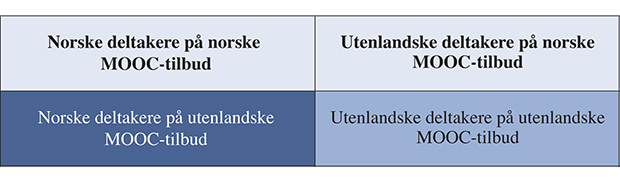 I vurderinger av utdanningsstøtteordningen må det tas hensyn til at det er snakk om ulike grupper av deltakere. Det er relevant å vurdere ordningen opp mot både norske og utenlandske MOOC-deltakere, og opp mot både norske og internasjonale MOOC-tilbud. I så måte mener utvalget at der er fire grupper av deltakere som utdanningsstøtteordningen må vurderes opp mot. Disse er synliggjort i figur 17.1.