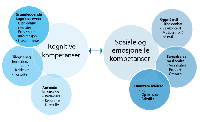 Mye av forskningen på læring har handlet om kognitiv læring, det vil si hvordan en person tilegner seg kunnskaper og ferdigheter og bruker egen tenkning i ulike sammenhenger. De siste 20 årene har forskningen også inkludert sosiale og kulturelle forhold og gitt økt kunnskap om hvordan læring ikke bare involverer tankeprosesser/kognitive prosesser, men også personers følelser, motivasjon, sosiale ferdigheter og relasjoner. Læring skjer ved at tenkning, følelser og motivasjon utvikles gjennom et samspill.2 Nyere forskning gir støtte til at sosiale og emosjonelle kompetanser har betydning for hvordan elevene lykkes videre i livet.3 Boks 3.1 beskriver hva utvalget legger i begrepene kognitiv læring og kompetanse og sosial og emosjonell læring og kompetanse, og viser hvordan et bredt kompetansebegrep integrerer de to formene for læring.